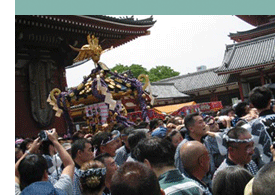 Mein Highlight in Asakusa ist das jährlich stattfindende Yabusame, das traditionelle Bogenschießen zu Pferde. Wenn man sehr rechtzeitig da ist kann man noch einen Sitzplatz auf den Holzbänken ergattern, der Rest muss dahinter stehen. Nach einer Begrüßungszeremonie beginnt das eigentliche Turnier, bei dem verschiedene Reiter in bunten Kostümen die Sandbahn entlang galoppieren und auf drei aufgestellte Holztafeln schießen müssen. Ziel ist es nicht, die Mitte zu treffen, sondern überhaupt so zu treffen, dass das Holzbrett kaputt geht. Gar nicht so einfach wenn man bedenkt, dass die Pferde galoppieren und der Abstand zwischen den Zielscheiben so knapp ist, dass kaum Zeit zum Nachladen bleibt. Das Ganze ist ein ziemliches Spektakel, die Zuschauer fiebern mit allen Reitern gleich stark mit und würdigen jeden Versuch egal ob gelungen oder nicht mit großem Applaus. Sehr faire Angelegenheit.